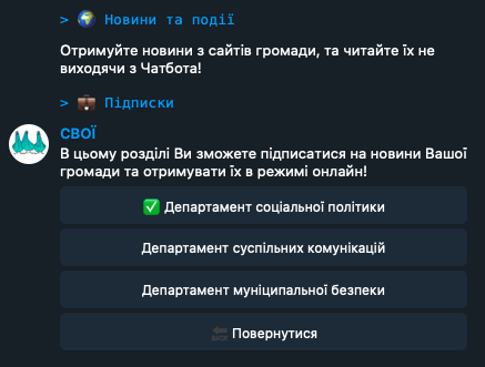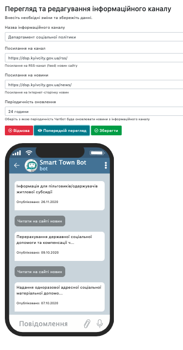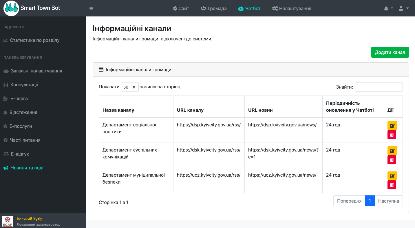 Розділ дозволяє створити канали новин, які можуть бути доступними у чат-боті для перегляду у розділі “Моя громада – Новини та події” і для оформлення підписки на оновлення. Система із заданою локальним адміністратором для кожного каналу періодичністю перевірятиме канал і у разі виявлення доданих новин розсилає повідомлення із заголовками новин всім користувачам які оформили підписку на даний канал у розділі чат-боту “Моя громада – Новини та події – Підписки”