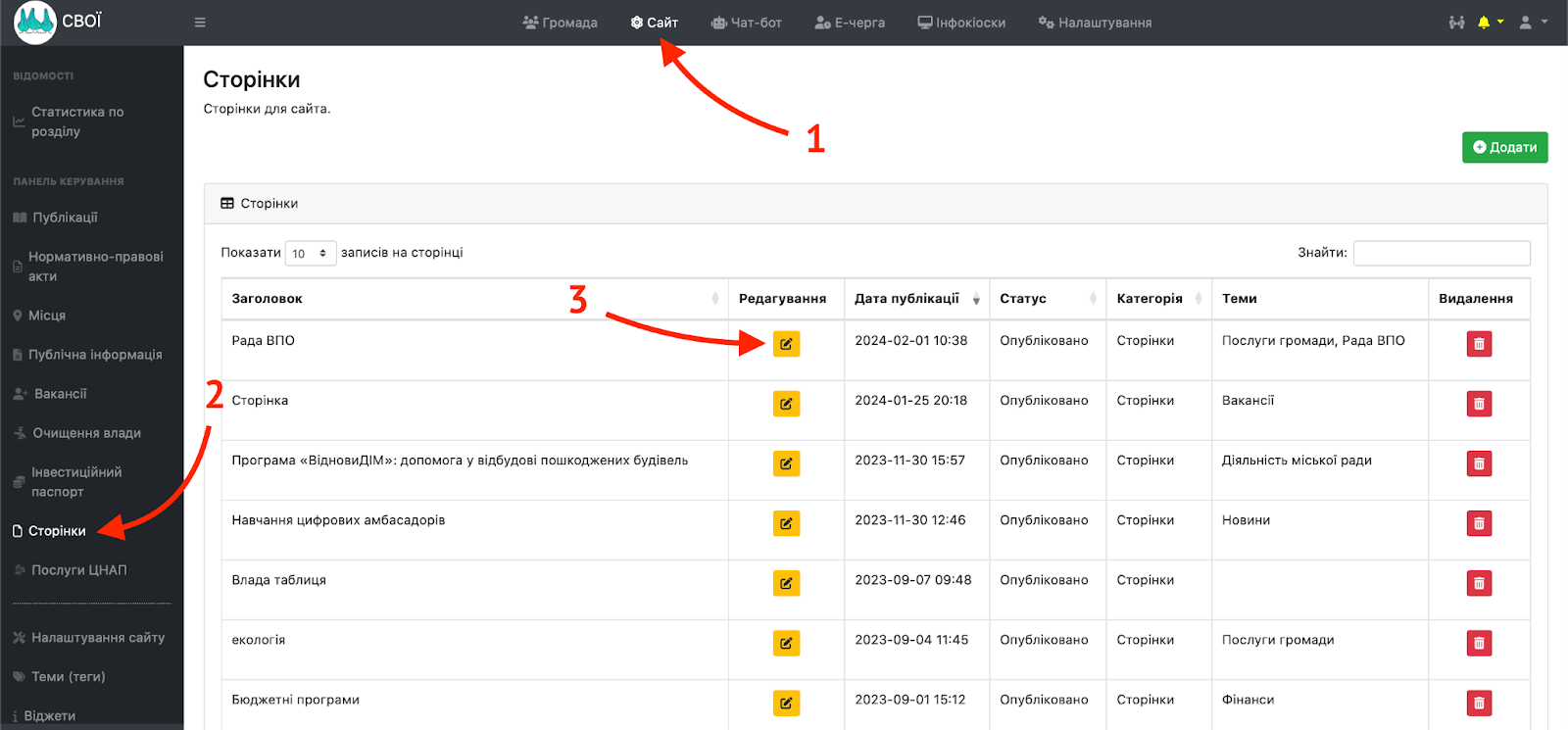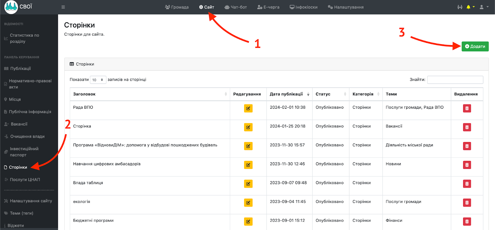 Щоб створити власну внутрішню сторінку на сайті громади в адміністративній панелі потрібно увійти в розділ “Сайт”, обрати вкладку “Сторінки” на панелі зліва та натиснути кнопку “Додати”.