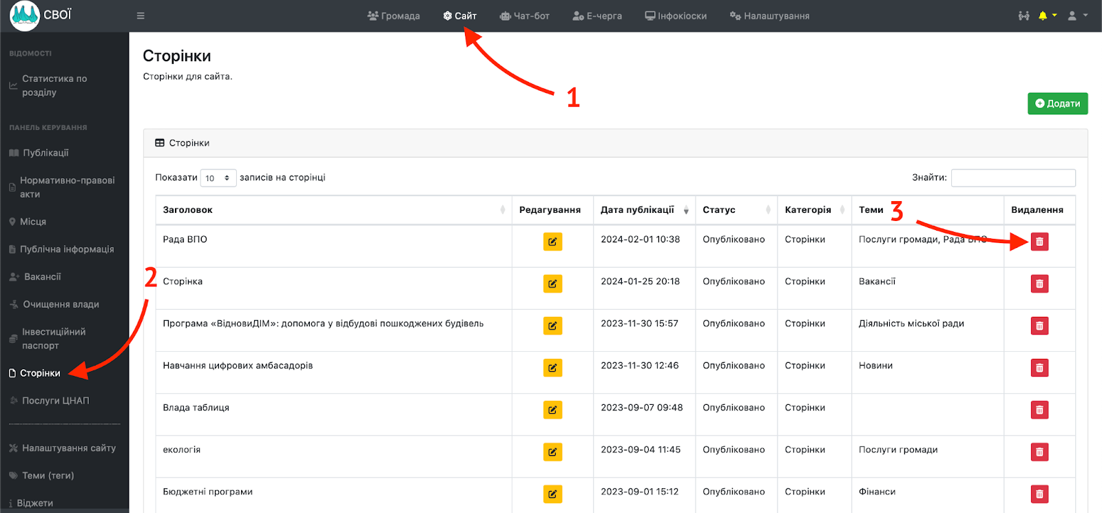 Щоб видалити раніше створену внутрішню сторінку сайту громади в адміністративній панелі потрібно увійти в розділ “Сайт”, обрати вкладку “Сторінки” на панелі зліва та натиснути кнопку видаленнянавпроти потрібної публікації з переліку раніше доданих.